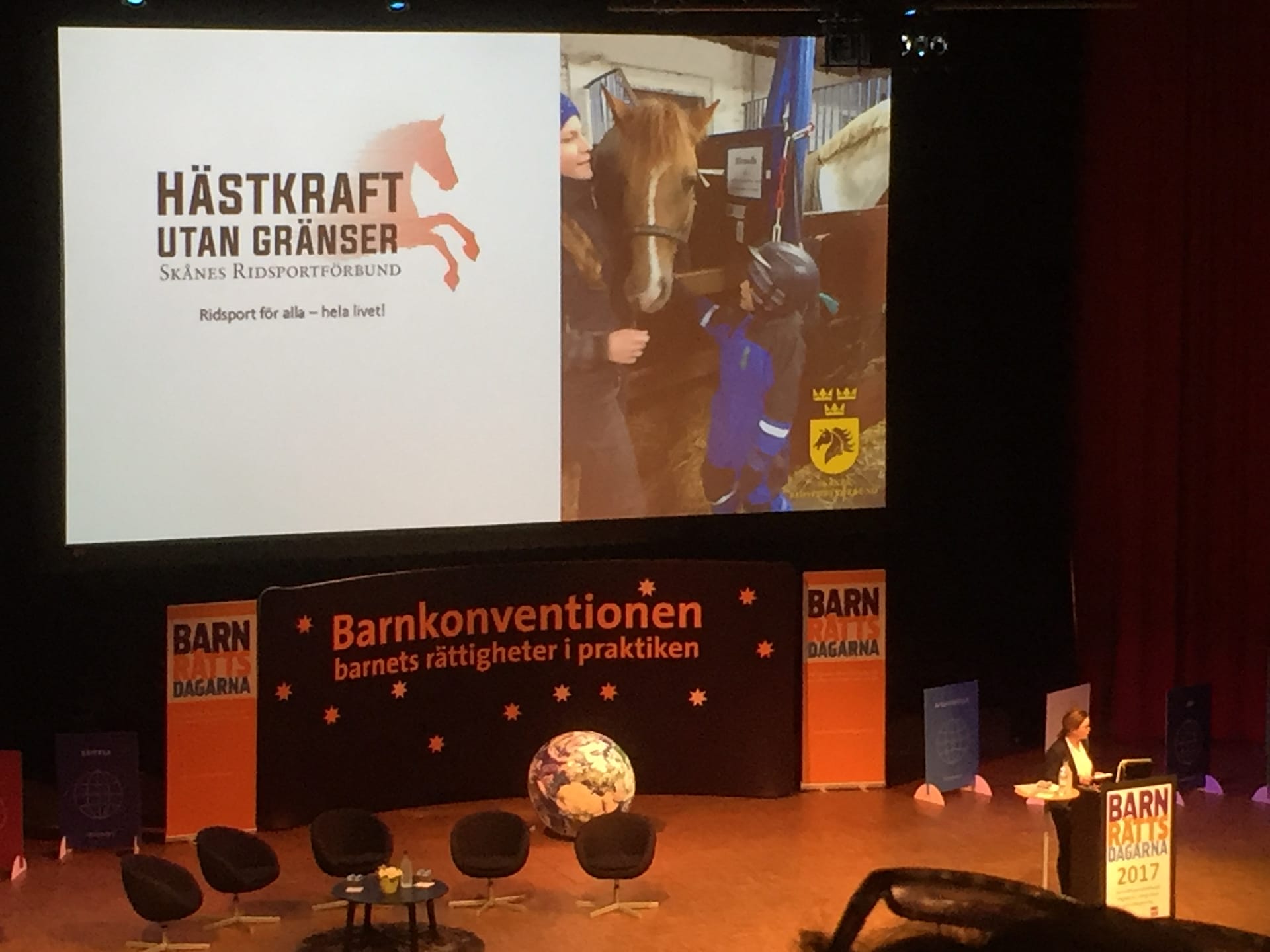 På Barnrättsdagarna i Örebo, Sveriges största multiprofessionella forum för arbetet med barns rättigheter, presenterades Skånes fina arbete med projektet ”Hästkraft utan gränser”. Ett projekt för att förverkliga barn och ungas rätt till social integration, hälsosamma aktiviteter och en meningsfull fritid.